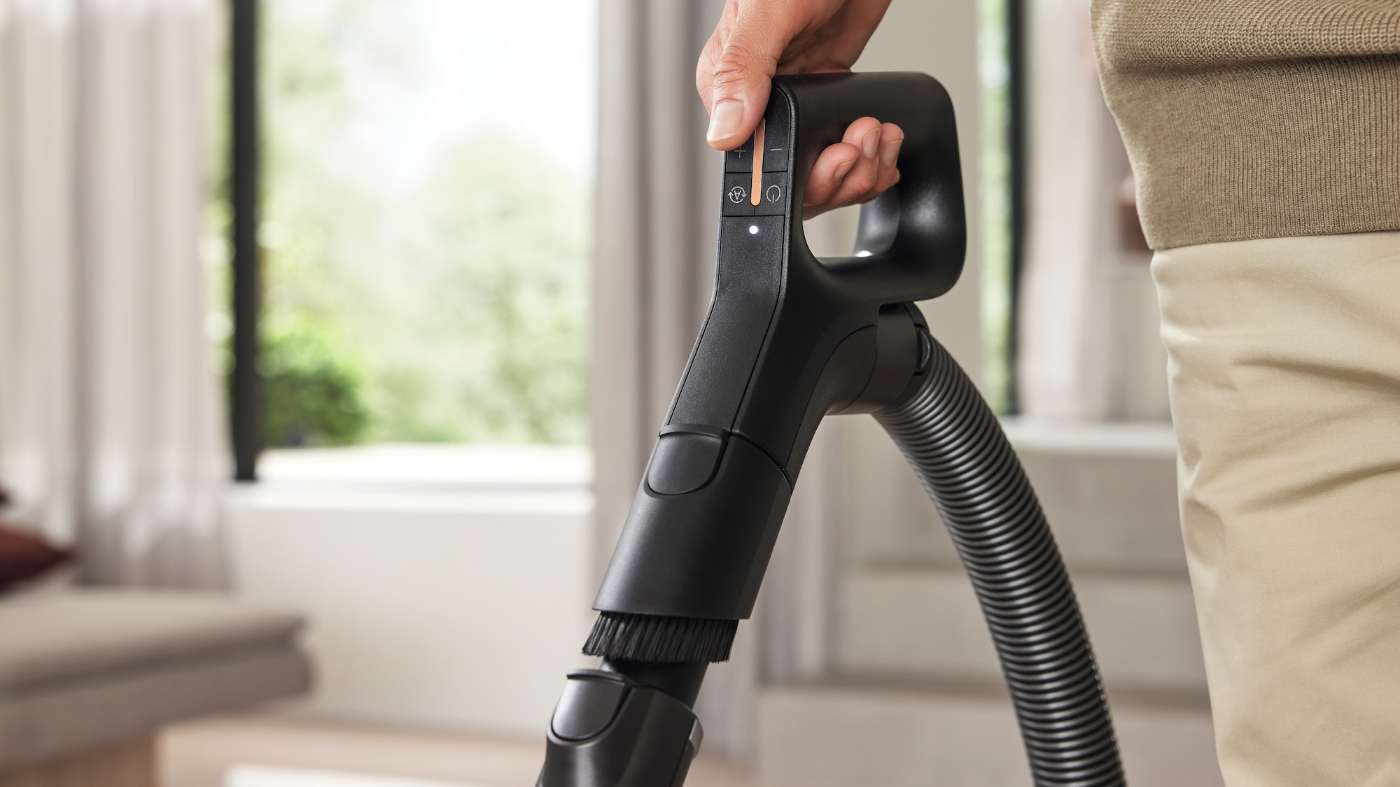 Az intuitív érintőgombok rendkívül kényelmesek, és lehetővé teszik, hogy lehajlás nélkül váltson a tisztítási üzemmódok között. Ujjának egy egyszerű érintésével könnyedén hozzáférhet a Guard L1 Comfort modell minden funkciójához, ami ezáltal egy igazán felhasználóbarát eszköz, és a modern otthonok ápolásának stílusos központi eleme lesz.
